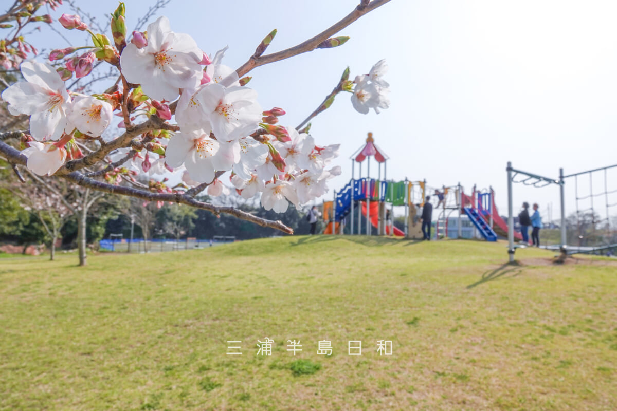 三浦市で桜の名所と言えば早咲きの河津桜が有名ですが、ソメイヨシノの季節に限定すれば、潮風スポーツ公園は市内最大のお花見スポットです。