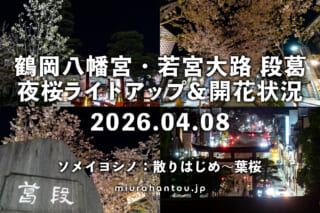 鎌倉・鶴岡八幡宮・若宮大路 段葛桜並木の夜桜ライトアップ&開花状況<ソメイヨシノ:散りはじめ~葉桜>
