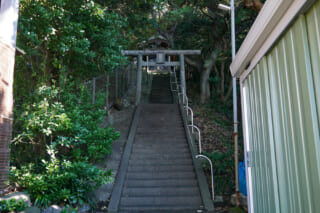 古くは逗子郷沼間の地に祀られていましたが、御祭神が暴神であったため、一人の老人が御神体を田越川に流してしまいました。その後、御神体は川を下り、海に出て、葉山郷鐙摺の向島に流れついたところを、ちょうど居合わせた翁がすくい上げました。
