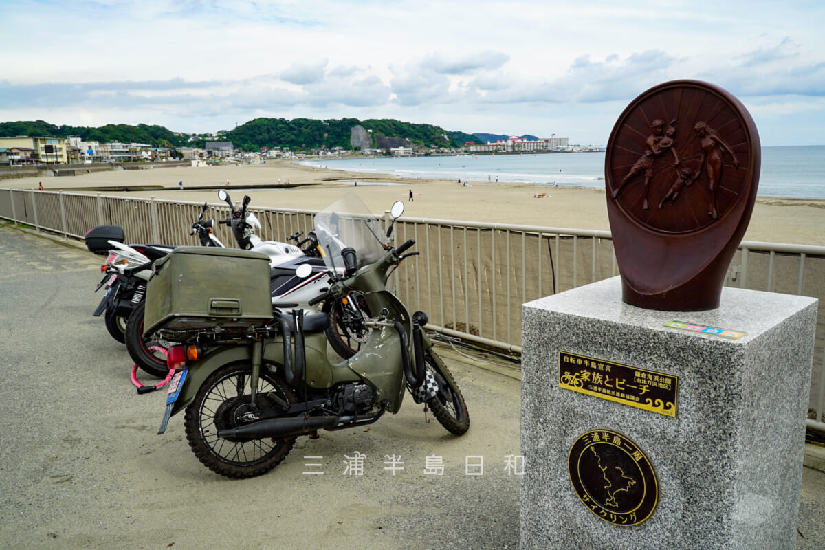 由比ヶ浜の砂浜沿いには駐輪場もあり、三浦半島のサイクリングマイルストーンのモニュメントも設置されています。